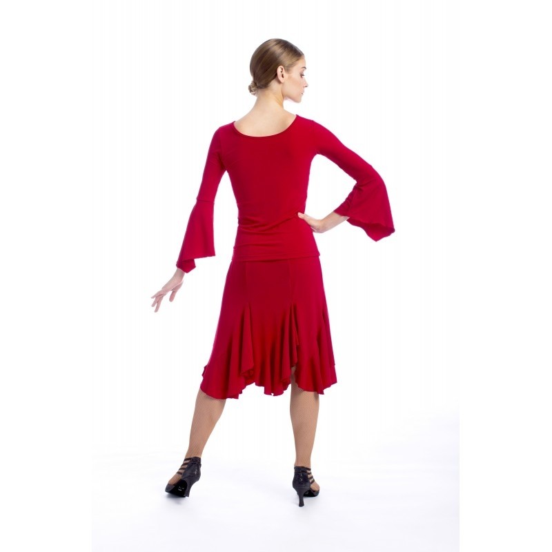 Jupe de danse avec volants insérés au bas, très fluide, pour accentuer les mouvements du corps. Ceinture élastique à la taille.